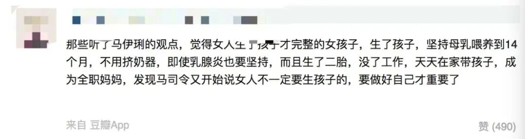 “听了马司令的话,觉得女人生孩子人生才完整,于是生孩子,坚持母乳,不用挤奶器,乳腺炎也坚持,生了二胎,没了工作,天天在家带孩子,结果,马司令突然又说——女人做好自己才重要”
