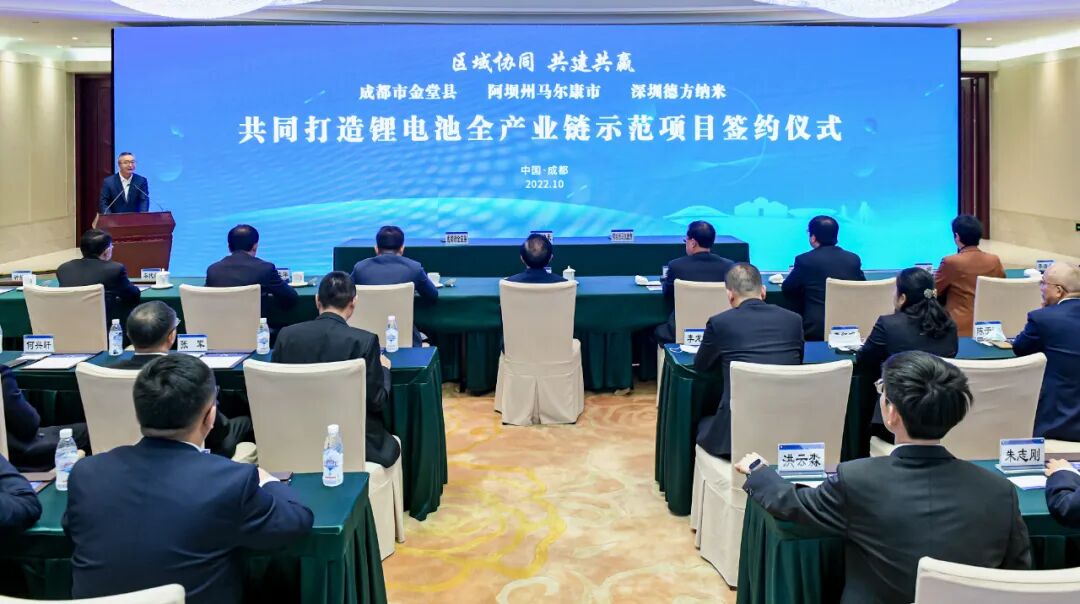10月28日,成都市金堂县人民政府、阿坝州马尔康市人民政府、深圳市德方纳米科技股份有限公司共同打造锂电池全产业链示范项目暨金堂县建圈强链重大项目集中签约仪式在成都天府新城会议中心举行。