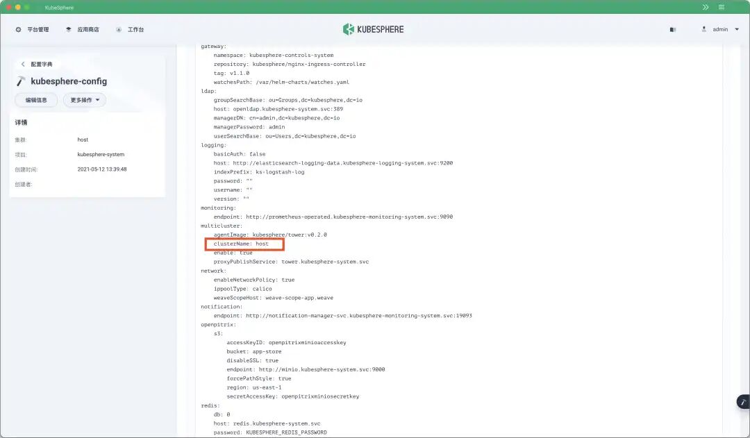 v3.3.0 解决了这个痛点,将集群名称添加到了 ConfigMap kubesphere-config 中,因为每个集群都会有这个 ConfigMap,所以集群中的应用可以通过这个 ConfigMap 获取到自身所在的集群名称。