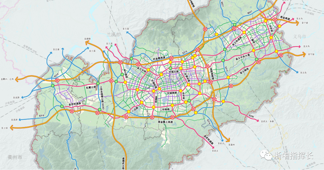 其中,“两环”为主城区一环路、二环路,“两纵”为金义新城区广顺街、东华街,“三连”为连接主城区和金义新城区的金义快速路、金义中央大道和金义南线,“九射”为市区向兰溪、义乌、永康、龙游等方向的九条快速路。