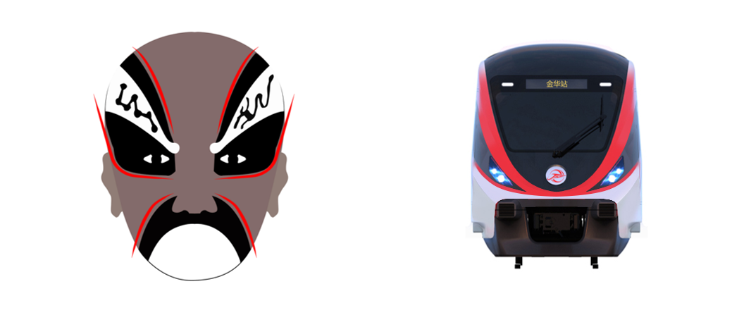 车头外观的造型灵感来源于金华传统文化中极具代表的婺剧元素。将婺剧脸谱进行提炼,进行表情特征设计,将婺剧表演的精、气、神融入到车头的外观设计中,实现传统元素与现代科技的结合。