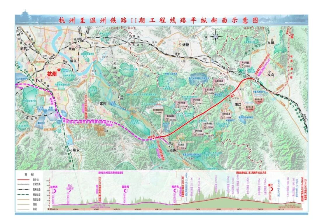 杭温铁路二期自桐庐东站引出后向东南,经杭州市桐庐县,金华市浦江县、义乌市,引入义乌站杭温场,全长59公里,设计时速350公里,全线设桐庐东(仅含站房)、浦江、义乌(不含)3站,总投资94.8亿元,工期3.5年。项目建成后将打通浙江南北纵向铁路通道,实现杭州至温州“1小时交通圈”,进一步优化长三角地区高速铁路网络,强化区域协作和城市集群联系。