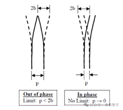 图7:由于相位方向而造成的风扇螺距限制。实线表示瞬时风扇位置,虚线表示最大振动振幅