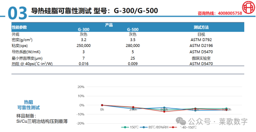 可以看出,G-300/G-500的最小界面厚度可达到7μm、25μm,热阻低至0.016和0.009。