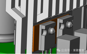 导热硅脂使用还需要注意热源面与散热端的安装方式、锁附机构等结构设计。在此项目中,MOS管金属面涂抹导热硅脂,与散热器接触,用螺丝锁紧,如下图所示,