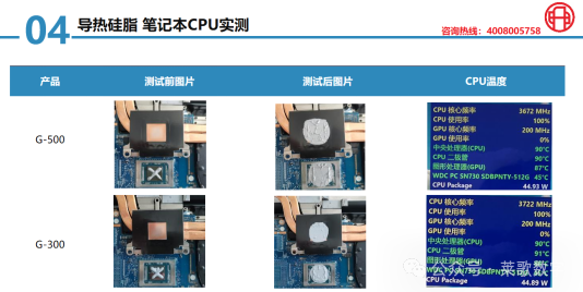 G-500、G-300的导热硅脂经过笔记本CPU实测的前后效果对比,如下图所示,