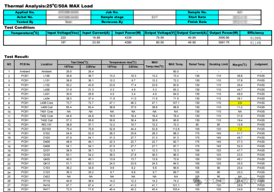 在仿真后期,打样组装成品之后,我们对实物做了温升测试,测试数据如下表所示,