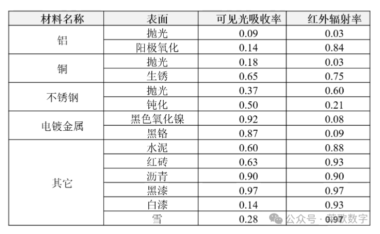 室温下常见表面的可见光吸收率和红外线表面发射率。