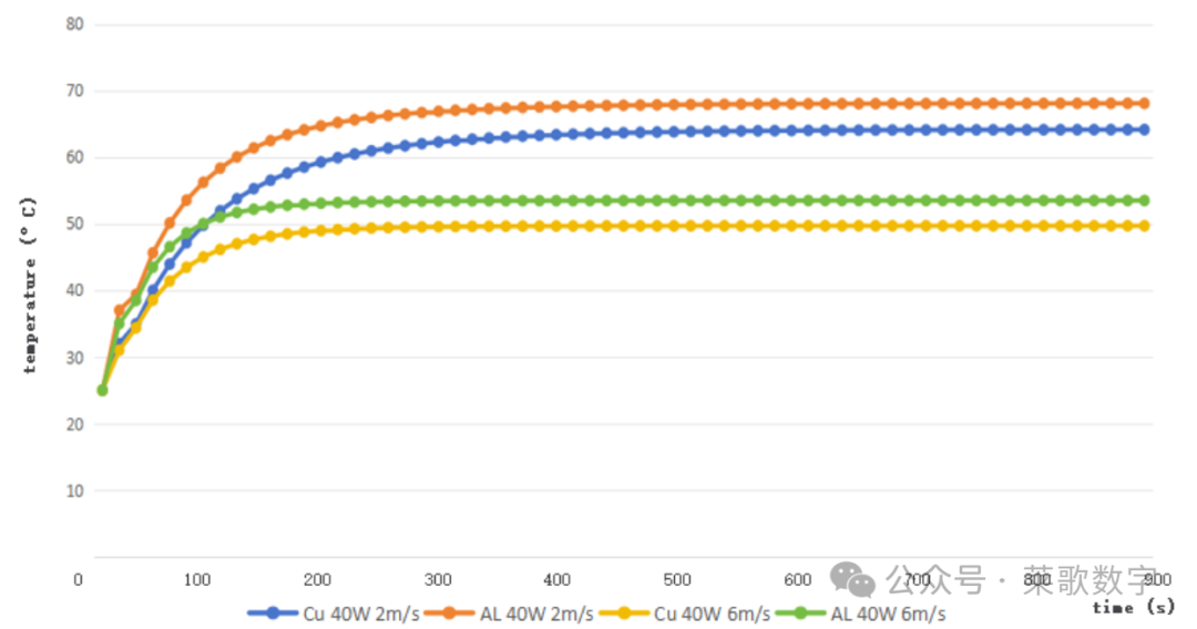 与相同流量条件下的铜散热器相比,相同尺寸的铝散热器具有较快的响应时间。铜散热器热阻较小,需要较长的时间才能达到稳定状态。