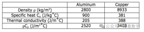 铝和铜的物理性质列于表2。虽然铜的密度是铝的3.2倍,但铜的ρCp(密度和比热的产物)仅是铝的1.4倍。
