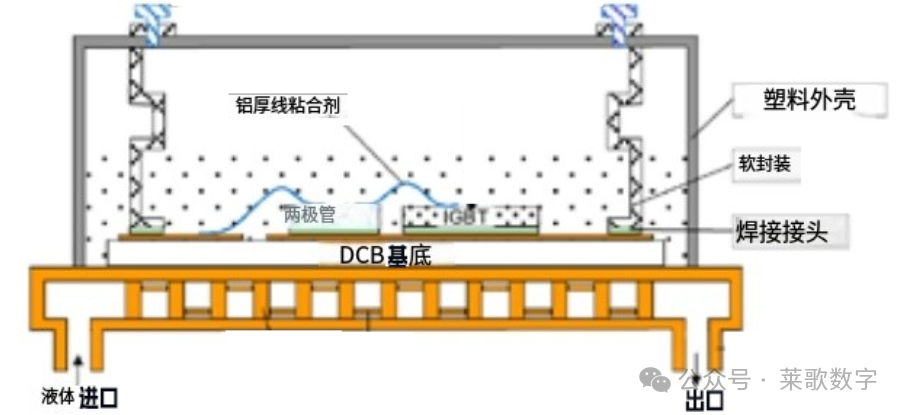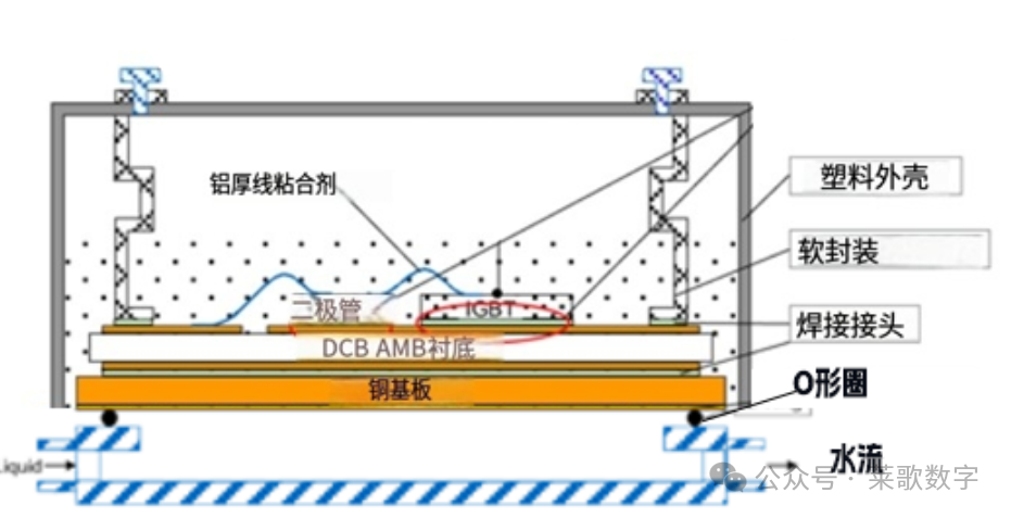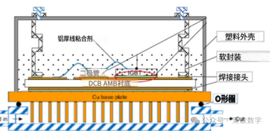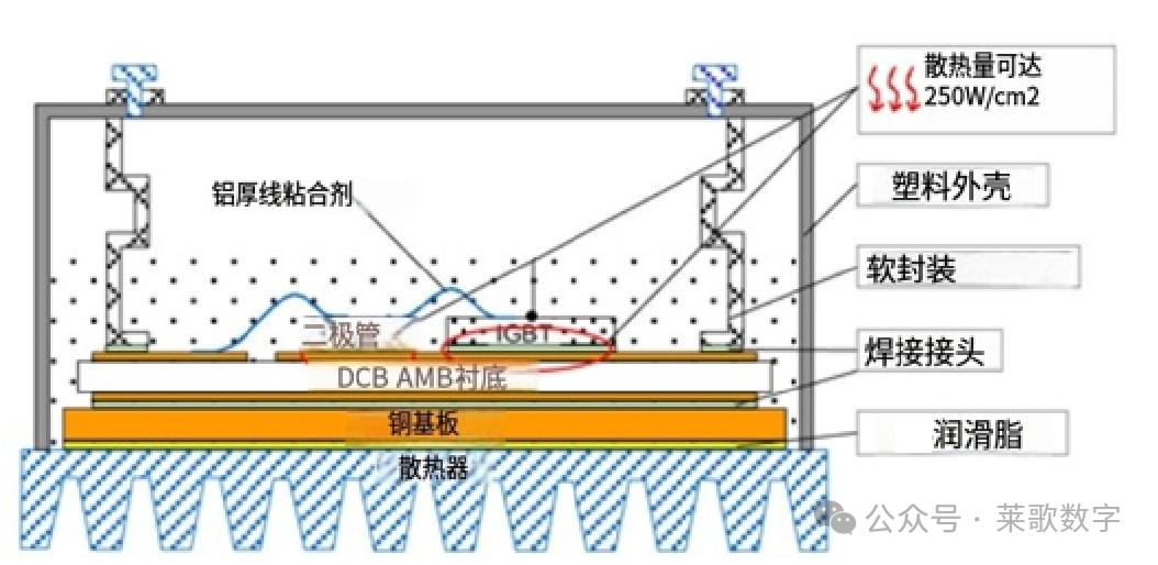 基于硅的电源芯片(例如IGBT、MOSFET和二极管)被焊接到陶瓷基基板上,然后将基板焊接到铜基板上,铜板的另一边被安装在一个风冷的铝散热器上。