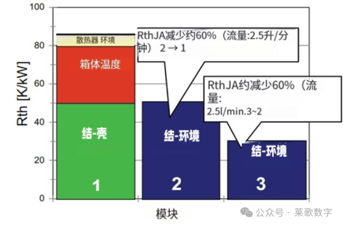 图12比较了具有导热硅脂层(柱1)的液冷金属板上的标准模块、具有液冷微通道基板和氧化铝基板(柱2)的标准模块以及具有集成AlN基板(柱3) 的标准模块的热阻。