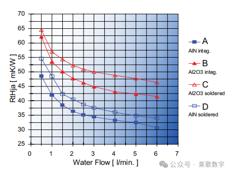 基板A和B直接集成,C和D焊接在铜冷却器上。对于低流量,可以观察到对水流的强依赖性。