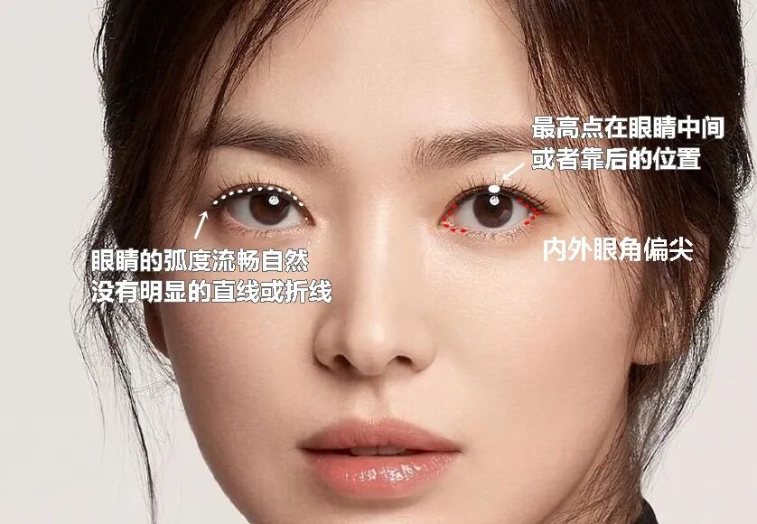 一般来说,好看的眼型都有下面几个特点:内外眼角偏尖、眼睛的弧度自然流畅,没有明显的直线和折线,眼睛的最高点也大多在在眼球中央或者稍稍偏后的位置。