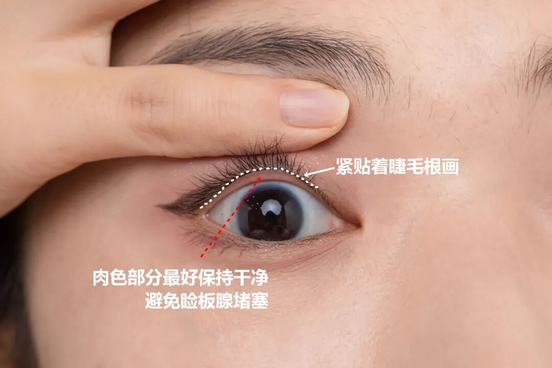 眼线只画在睫毛根部上方的缝隙就好,千万不要画到睑板腺(里面肉色粘膜的部位)!▼