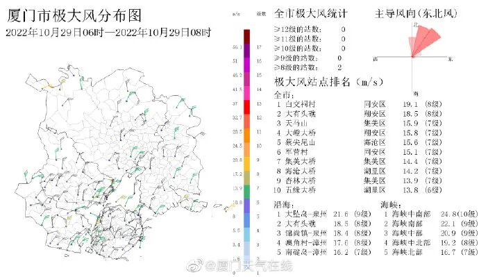 最大风力时段出现在10月31日—11月1日,预计厦门市区东北风最大可达6—7级、阵风8—9级;内海及各大桥、高海拔山区最大可达7—8级、阵风9—10级;崇武到东山沿海最大可达8—9级、阵风10—11级;台湾海峡南部最大可达9—11级、阵风12级。