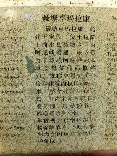 聂塘卓玛拉康,又称聂塘度母寺,位于拉萨市曲水县聂塘乡318国道公路西侧,距拉萨市西南二十三公里。约在一千年前阿底峡尊者(Atisha,982-1054)驻锡说法之圣地。阿底峡尊者曾在此讲学居住九年,直至圆寂。因主供阿底峡尊者生前随身供奉的本尊度母铜像(即卓玛佛像),遂名卓玛拉康,又名聂塘度母殿。