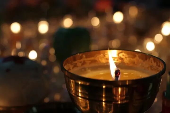 《贤愚经•贫女难陀品》中讲过这样一个公案:佛陀在舍卫国时,国中有个女人叫难陀,她生活贫穷,依靠流浪乞讨为生。因常常看到波斯匿王等王公贵戚在佛面前供养,她就想:“我前世没有积累资粮,以致今生贫穷卑贱,现在遇到如此广大的福田,一定要种下福德。”于是她四处乞讨,终于化到一枚钱。拿着这枚钱去买油做灯时,卖油人说根本不够,但是出于同情,就给了她两倍的油,刚好够做一盏灯。贫女非常高兴,把油灯放在佛陀面前的众灯之中,默默发誓:“我是个很贫穷的人,只能用此小灯供养佛陀。愿以此功德,让我来世得到智慧的明灯,灭除一切众生的愚昧黑暗。”发誓之后,她便顶礼而去。第二天,所有供灯全部熄灭,唯独她这盏灯依然明亮,灯油、灯芯毫无减损,如同新点的一样。目犍连去收拾灯具时,想把它灭掉,等晚上佛讲经时再供,但以各种神通也没办法熄灭。(大家都知道,目犍连是神通第一,他的神通并不是像现在的魔术师或能力大一点的人,他用小指来撼动整个三千大千世界,也一点问题都没有。但这么大的神通都无法熄灭这盏灯。)佛陀告诉他:“你们声闻弟子的神通,根本不能灭掉发大乘菩提心之人的灯。”并授记贫女未来成佛。这盏灯在印度引起了很大的轰动,举国上下无论男女老少,争相做灯供佛,历时七天七夜。以此因缘,佛陀宣讲了自己前世当牟尼王女的整个经历。所以,供灯时发菩提心是很重要的。