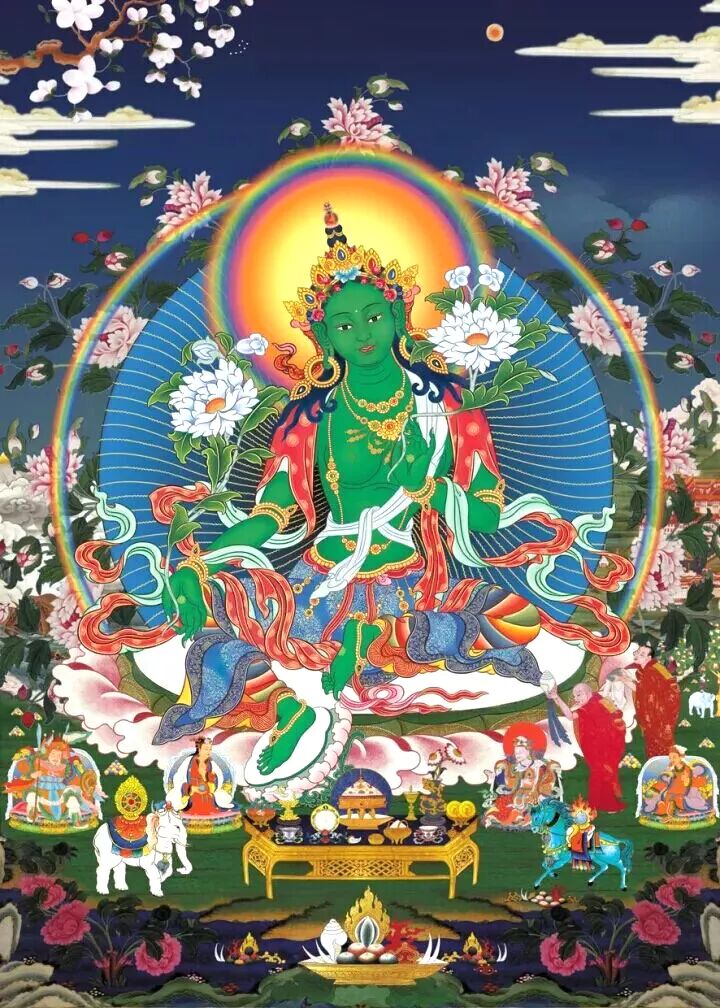 还有一次,阿底峡尊者在菩提迦耶,佛陀证悟的圣地,他绕着大佛塔经行时,圣救度母和颦眉佛母化现成两名庄严的年轻女子站在靠佛塔南边的莲花池畔,其中一位问另一位说:“什么是达到圆满开悟的最好修行方法?”