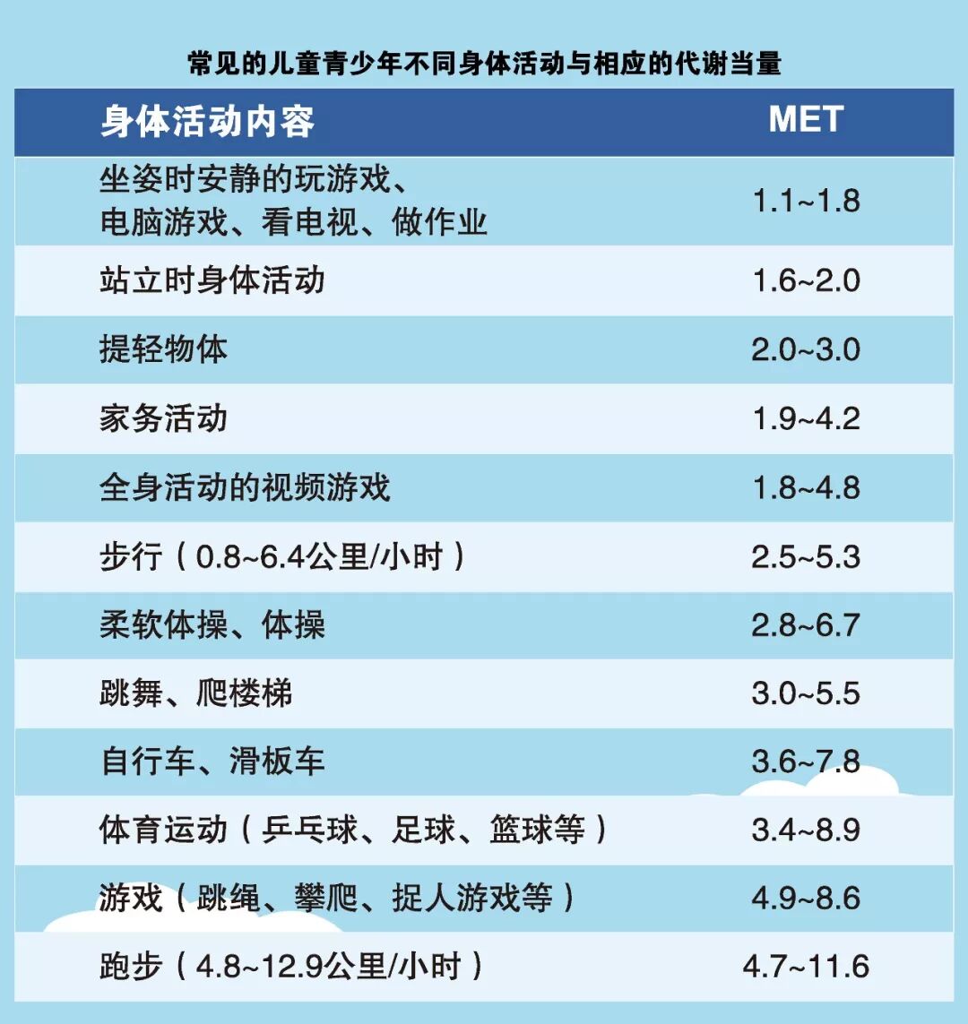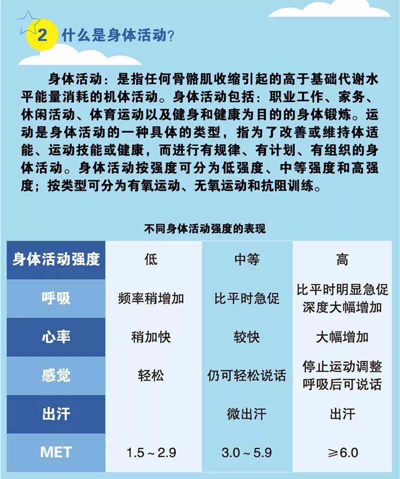 在本次指南中,除了给出身体活动的推荐量以外,经过专家组反复讨论,最终指南中涉及的内容还包括:非专业人员使用的身体活动强度的评价方法;身体活动与伤害关系;不同气候环境下身体活动建议和对儿童人群发病率较高的哮喘儿童身体活动建议。