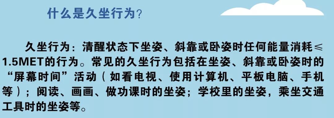 除身体活动之外,本次指南还专门强调了公众容易忽视的久坐行为问题。尤其强调了,久坐行为对健康的危害是独立于身体活动的,也就是说即使达到了每天推荐的60分钟的中高强度身体活动量,如果每天仍有较长时间的久坐行为,依然会对健康产生不利影响。