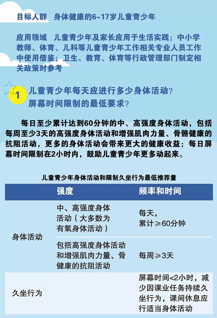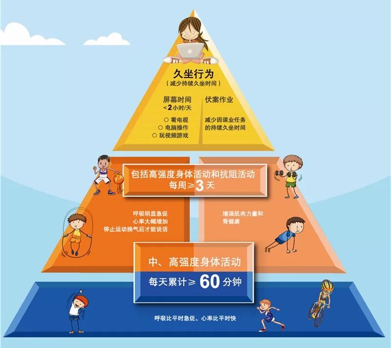 特别建议在保证每天60分钟中高强度运动时间以外,儿童青少年每日屏幕时间应限制在2小时内,并减少持续久坐行为,在课间休息时应进行适当的活动。