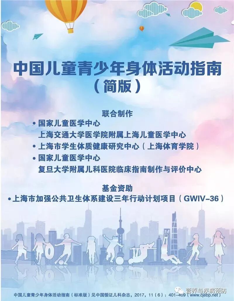 本指南的主要目标人群为健康的6-17岁的儿童青少年,在国内首次提出中国儿童青少年每天身体活动的推荐量。在充分参考了国际上28个指南的推荐意见的基础上,指南推荐:儿童青少年每日应进行至少累计60分钟的中高强度身体活动,包括每周至少3天的高强度身体活动和增强肌肉力量、骨骼健康的抗阻活动。