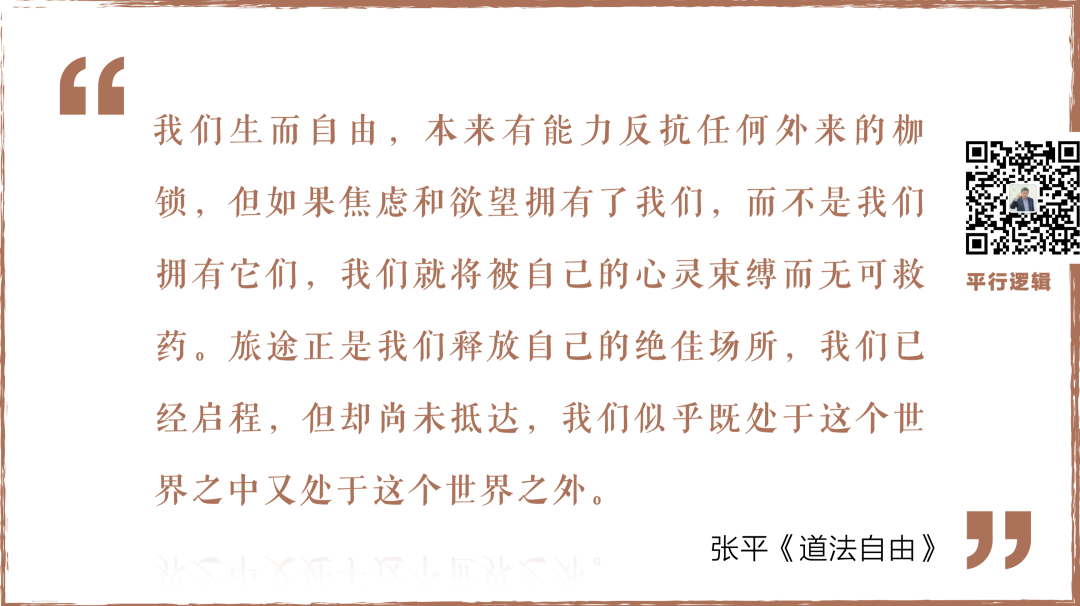 自由最根本的含义是:我们有能力从自我的奴役中解脱出来。我们生而自由,本来有能力反抗任何外来的枷锁,但如果焦虑和欲望拥有了我们,而不是我们拥有它们,我们就将被自己的心灵束缚而无可救药。旅途正是我们释放自己的绝佳场所,我们已经启程,但却尚未抵达,我们似乎既处于这个世界之中又处于这个世界之外。我们对那些现实的焦虑和欲望暂时无能为力,似乎也就有理由放任不管。