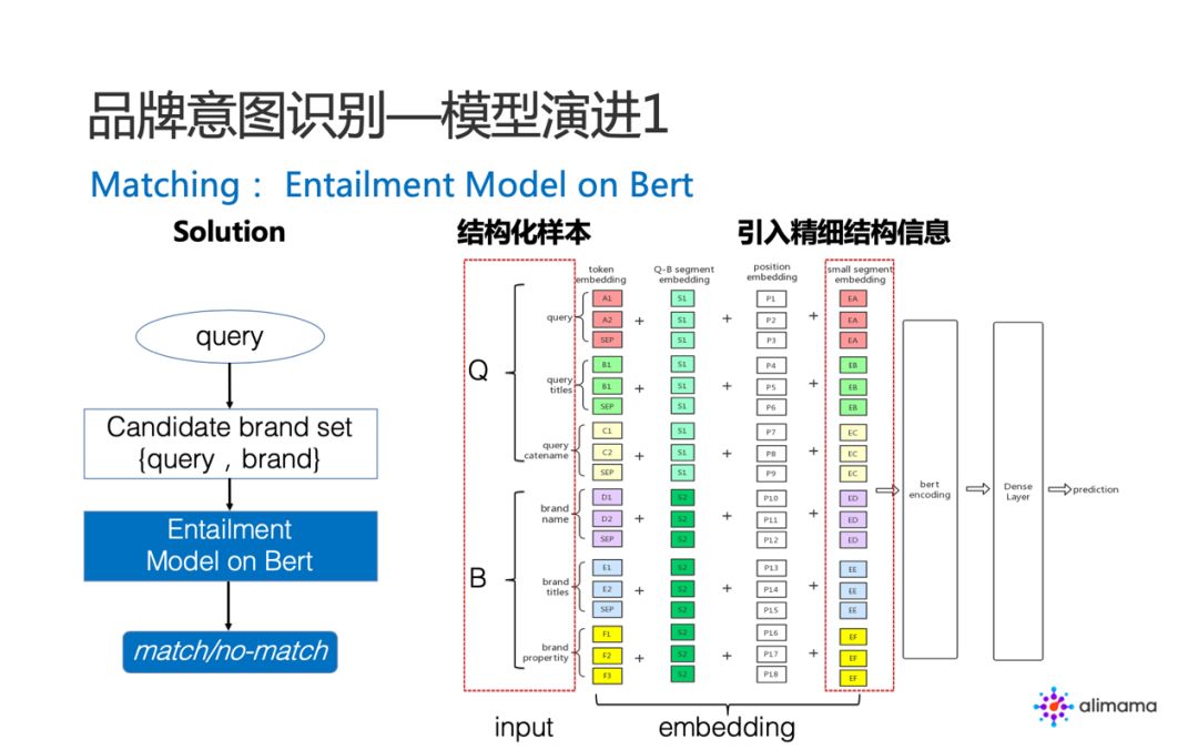 我们详细看一下 Entailment 模型实践,思路是对候选 < Q , B > 经过 Entailment Model 做一个预测,输出 match or no-match。其中,我们重点做了样本特征和模型结构上的一些设计。首先,样本特征上为了引入结构化的外部信息,我们将 Q 和 B 两个 segment 进行了三个 small segment 切分。在 Q 侧,small segment 分别是 query 本身、query click 的商品标题、query 的类目预测信息。B 侧也是一样的,分为候选 B 的标准品牌名称、品牌所属真实商品标题、品牌经营的类目信息。这是模型样本输入。对应地,我们在模型结构上针对 small segment 加入了一层 embedding,以更好地捕捉样本设计中的结构化信息。后续则正常输入到 Bert 进行 encoding,经过 n 层 dense layer 输出预测结果。