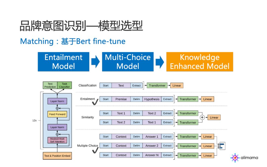 我们对品牌意图识别 matching 模型的演进分为三个阶段,已经完成的是前两个阶段,正在进行第三个阶段。前两个阶段主体思想是基于 Bert 进行 fine-tune。Bert 针对不同的 NLP 任务都有典型的建模方式,在该任务中,可以应用的有两个——Entailment task 与 Multi-Choice task。Entailment 任务中,Q 侧信息作为 Premise,B 侧信息则作为 Hypothesis。Multi-Choice 任务中,B 和 Q 分别作为 Context 和 Answer。