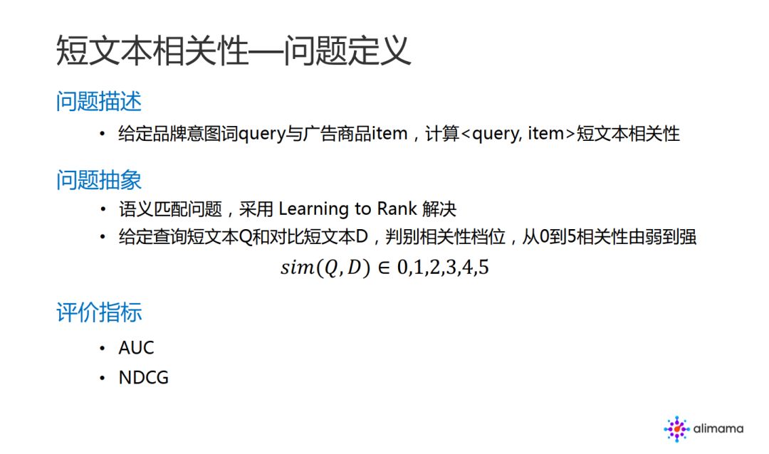 第二个算法任务是短文本相关性。问题描述是,给定一个品牌意图词 query 与广告商品 item,计算 < query , item > 短文本的相关性。可以把它理解为语义匹配的问题,采用 learning to rank 解决。进一步的形式化,给定查询的短文本 Q 和对应短文本 D,判别相关性档位,相关性从0到5相关性由弱到强。