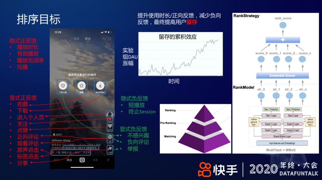 快手短视频推荐的主要优化目标是提高用户的整体的DAU,让更多的用户持续使用快手,提升用户留存。在具体的排序建模过程,提升使用时长/正向反馈,减少负向反馈,可以提高用户留存。从上图中部曲线可见,留存提升在累计一段时间后会带来DAU的置信显著提升。此外,在推荐中,用户反馈分四类: