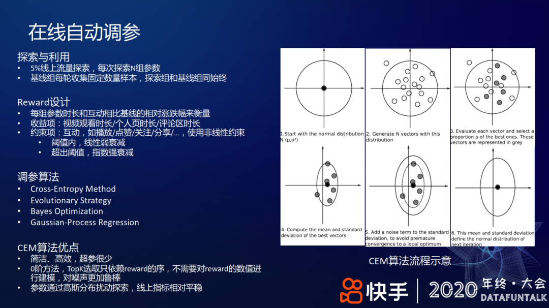 上述离线方法都有具有和Learn2Rank类似的缺陷,为了解决该问题,我们这边开发了在线自动调参框架。自动在线调参的工作机制如上图左下角所示,即在基线附近探索生成N组参数,传给推荐系统后获得这N组参数对应的展现给用户的差异化排序结果,从而获得用户不同反馈,收集这些反馈日志并做Reward统计,最终输给CEM/ES/BayesOpt等调参算法产生下一组更好的参数。经过不停迭代,参数即可逐渐向一个多目标协调最优的方向前进。