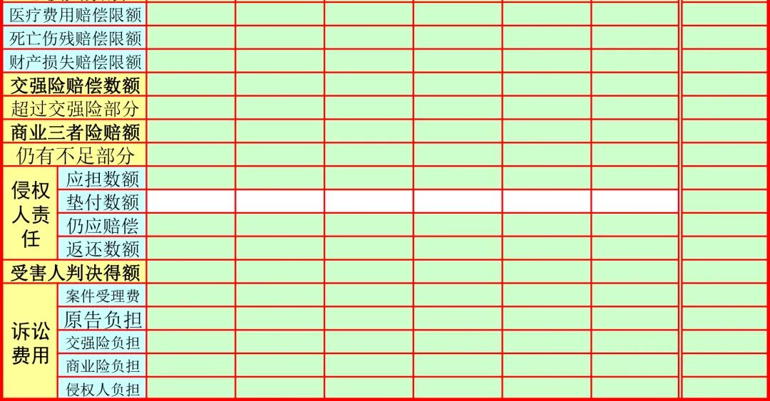(三)第三部分是赔偿项目,分别为医疗费、后续治疗费、住院伙食补助费、营养费、误工费、护理费、长期康复护理费、交通费、住宿费、残疾赔偿金、鉴定费、被扶养人生活费、残疾辅助器具费、丧葬费、死亡赔偿金、丧葬事宜支出费用、精神损害抚慰金、车货损失(包含车货辆和货物损失)、停运损失(包含非经营车辆替代交通费)、施救费、评估费等。每列白色单元格输入对应受害人的损失数额,绿色单元格则自动计算出交强险分项对应的各受害人的合计损失数额和总损失数额,最右侧一列绿色单元格则自动计算出所有受害人的合计数额。