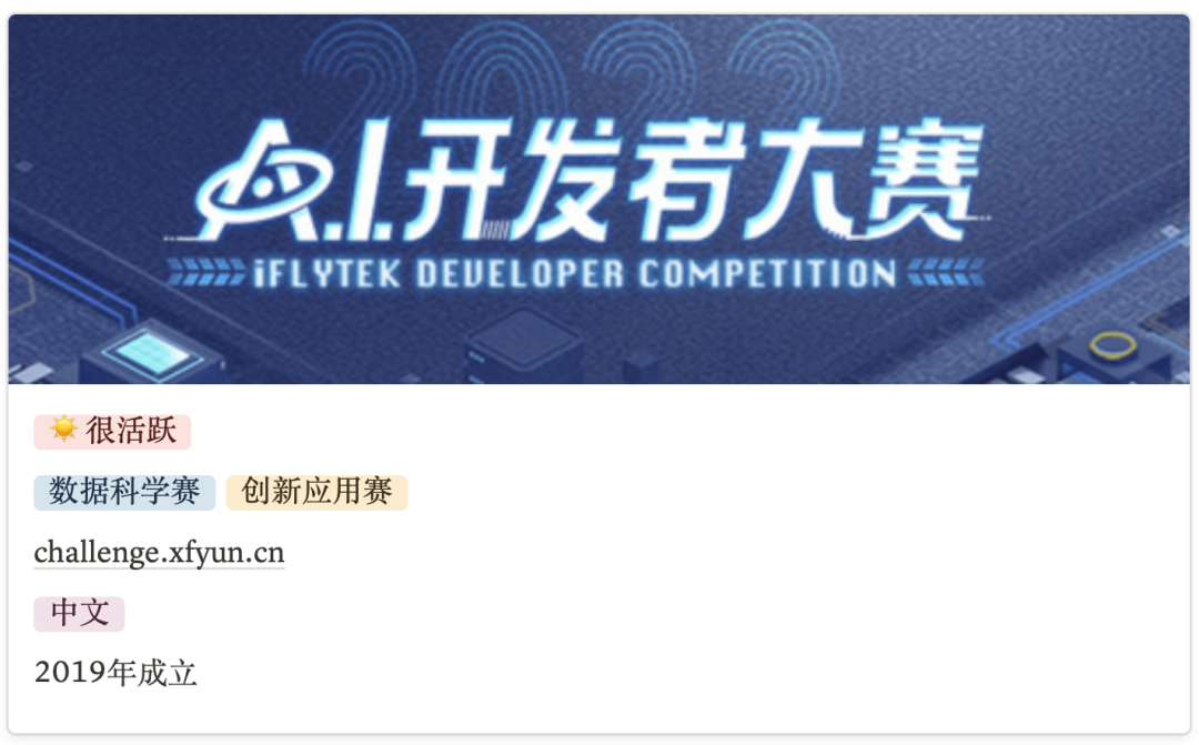 “iFLYTEK A.I. 开发者大赛”是由科大讯飞发起中国信息协会联合主办的人工智能竞赛平台,汇聚产学研各界力量,面向全球开发者发起数据算法及创新应用类挑战,推动人工智能前沿科学研究和创新成果转化,培育人工智能产业人才,助力人工智能生态建设。(来源于官网主页)