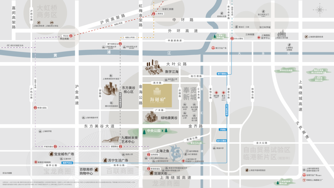 交通方面,项目周边S4沪金高速、金海公路、浦星公路、林海公路以及东方美谷大道、大叶公路等城市主干道构成了四通八达的交通路网。