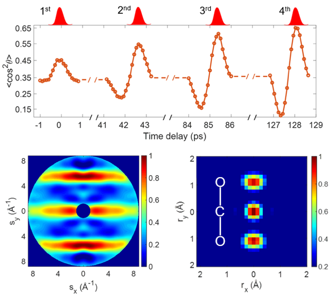 近期,上海交通大学张杰院士和向导教授领导的课题组利用在基金委国家重大科研仪器研制项目资助下研发的兆伏特超快电子衍射装置,结合多束超快激光相干地操控分子,证明了一种可在不结晶的条件下实现单分子结构解析的方法,并获得0.7埃的分辨率;该工作以“Ultrafast isolated molecule imaging without crystallization” 为题发表在《Proceedings of the National Academy of Sciences of the USA》[PNAS, 119, e2122793119 (2022)]。实验中利用四束飞秒激光脉冲相干地操控分子使得分子在特定时间处于相同的取向(类似获得分子“晶体”),同时利用接近光速(0.99 c)的超短电子束成功测量到处于短暂的准直状态(时间窗口约100飞秒,1飞秒=10-15秒)的分子的衍射斑,再结合相干衍射成像技术反演出分子的实空间分布。