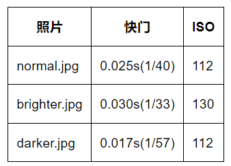 我们上面3张照片通过调整EV值来实现不同的曝光等级。下表是上面3张图片的exif信息。