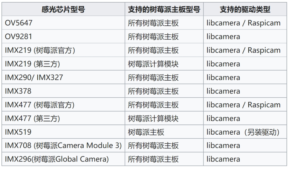 除了考虑camera,还要考虑与树莓派的兼容性。下表是一个不同传感器与树莓派主板和驱动的对应关系。