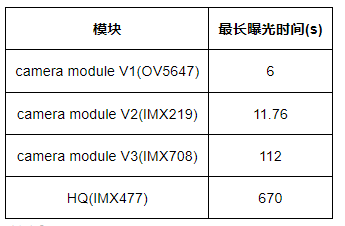 libcamera-still -o long_exposure.jpg --shutter 100000000 --gain 1 --awbgains 1,1 --immediate备注:几款官方摄像头的最长曝光时间参考表格.