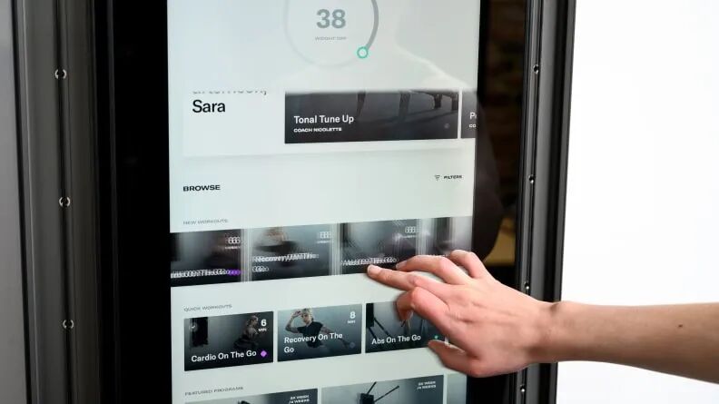外形跟Mirror类似的Tonal在镜面两边加了两根机械力臂,通过内置的电磁设备模拟高达200磅的阻力,以提供多站点合一的力量训练体验。