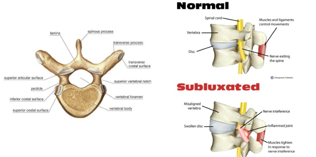 以胸椎为例,一个胸椎有12个关节面去连接相邻的锥体以及肋骨。轻微的肌肉张力不平衡都可能改变小关节间的相对位置从而可能影响到附近的血管及神经。