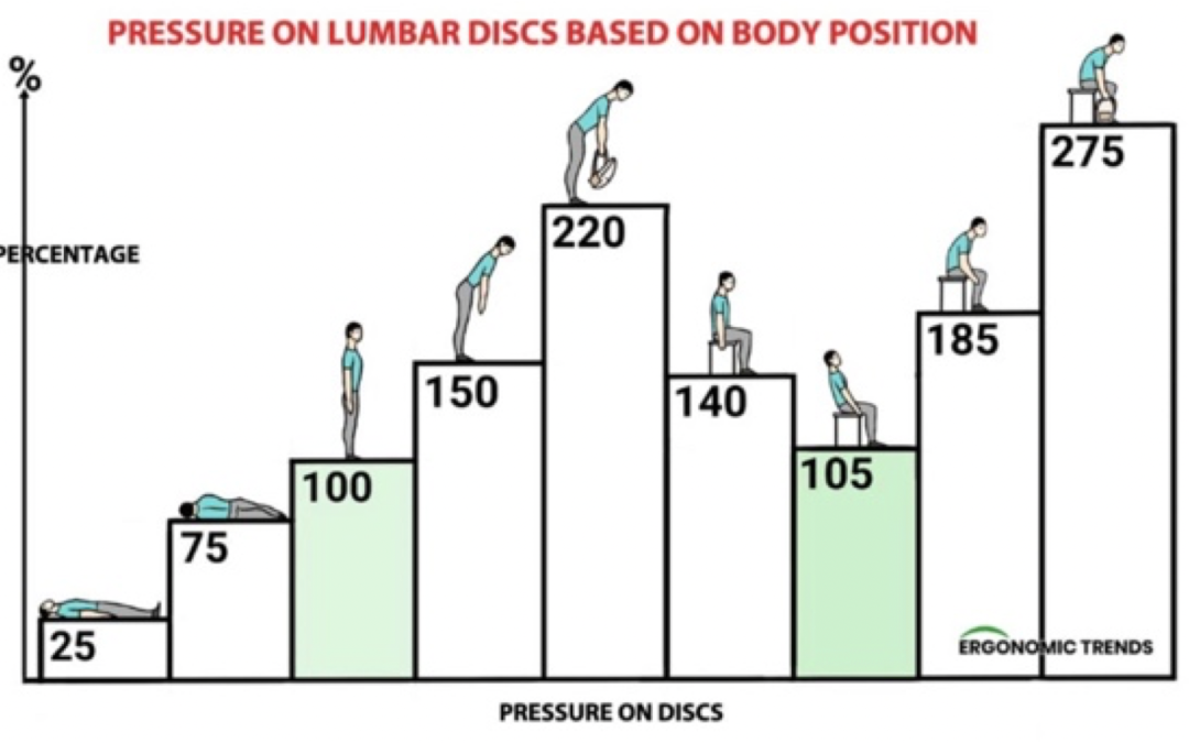 有研究数据表明,在坐姿状态时,脊柱会承担150%的压力。更值得注意的是,不正确的坐姿会让脊柱遭受到更大的压力,当身体前倾使用电脑时,脊柱承载的压力将会达到250%。