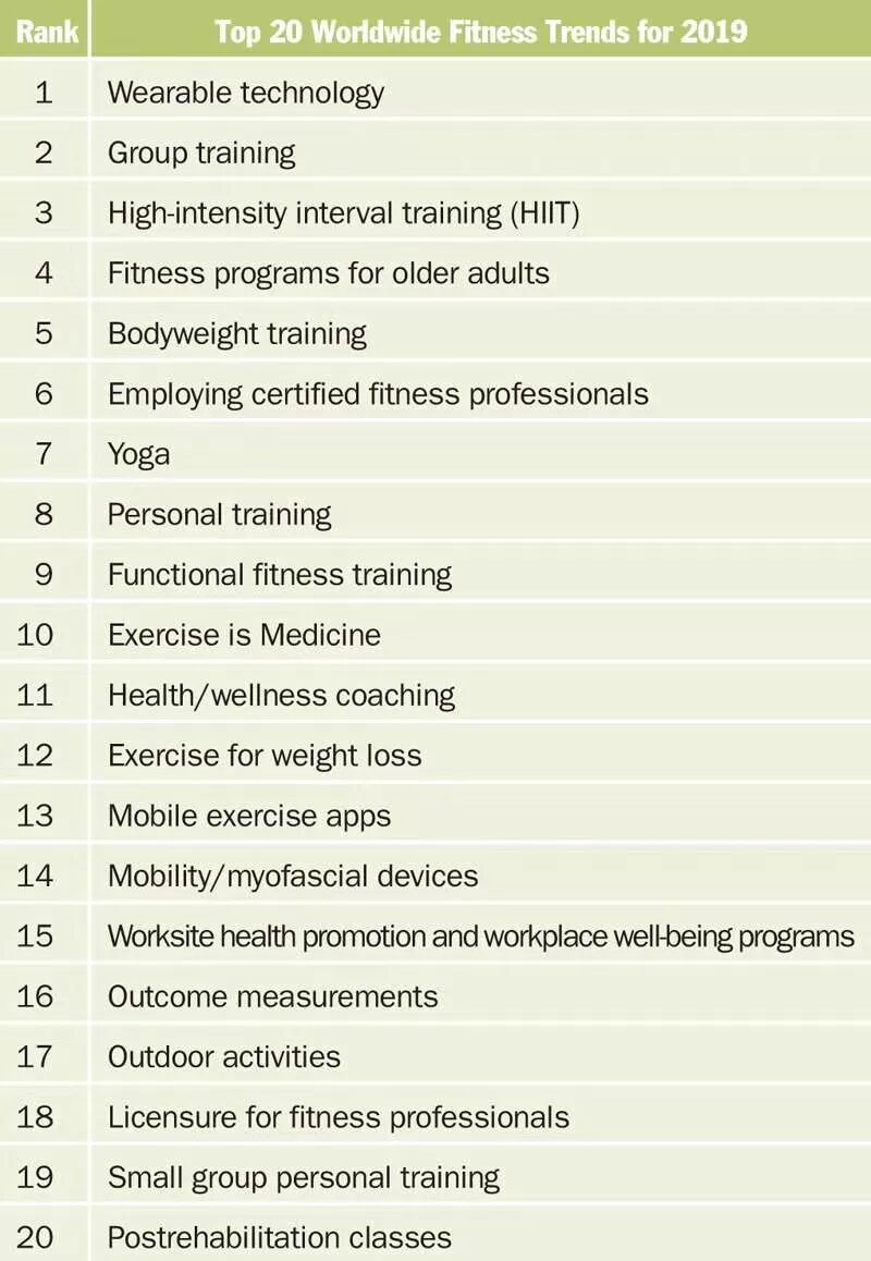 ■ 2019年ACSM全球健身趋势排行榜