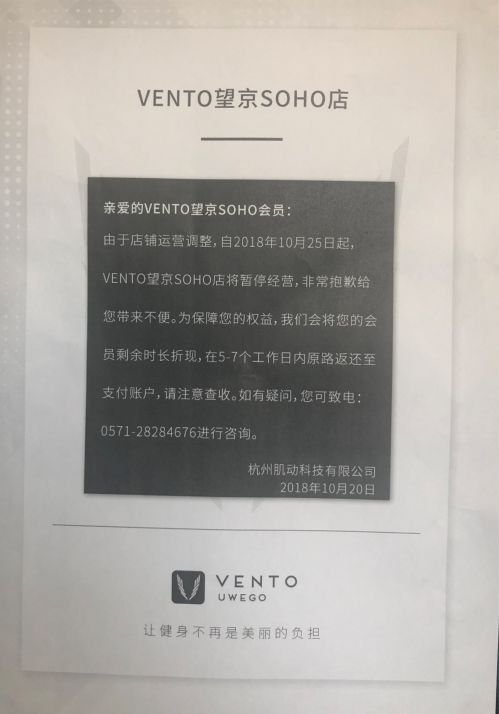 据体育大生意报道,VENTO的母公司肌动科技进行了战略调整,将关闭旗下所有的智能健身房,为已办理会员的用户退费,所有器械搬也将会运回杭州总部。