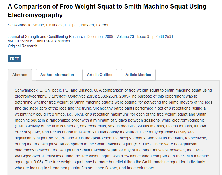 美国《Journal of Strength and Conditioning Research》一项研究发现,与史密斯机深蹲相比,自由重量深蹲时,肌电图显示肌肉平均活动高出43%。可以看到,作为身体处于不平衡状态时,也能发挥巨大力量的能力,核心稳定性需要一些自由的力量运动。