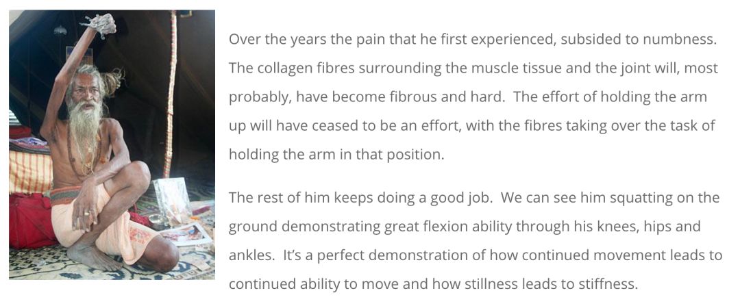 当然,也有「反面例子」,印度修行者Amar Bharati为侍奉湿婆神,选择在长达40年的时间内高举右臂从不放下,起初Amar Bharati痛苦异常,而随着静止状态下肌筋膜的加速固化,Amar Bharati的右臂逐渐失去知觉,不再因维持姿势而感到困难。
