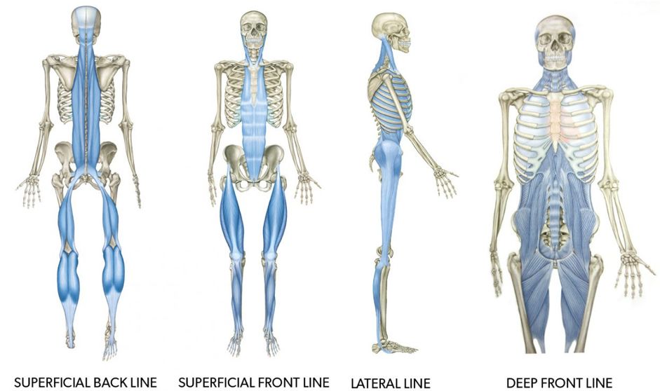 比如,《解剖列车》作者Tomas. W Myers所主张的把肌肉比喻成「火车」,它在不同的骨关节就是一个停靠的车站,而解剖列车可看作一整条肌筋膜线,基于此Tomas. W Myers提出了后表线、前表线、体侧线的概念。