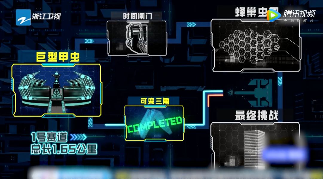 从节目赛制来分析。从可以看得到的第一期视频来看,1号赛道总长1.65公里,分为可变三角——巨型甲虫——时间闸门——蜂巢虫洞——最终挑战。对应的运动能力分别为障碍跑、抓吊、高空攀绳等等。