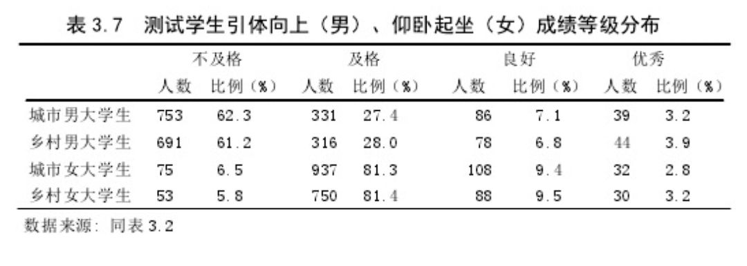 根据吉林大学2018年《我国大学生人口身体素质研究》中的显示,受调研的我国男性大学生中,引体向上有60%以上无法达成及格标准,而在1000米测试中,大学生不及格人数占比超20%,及格线上的人数最集中。